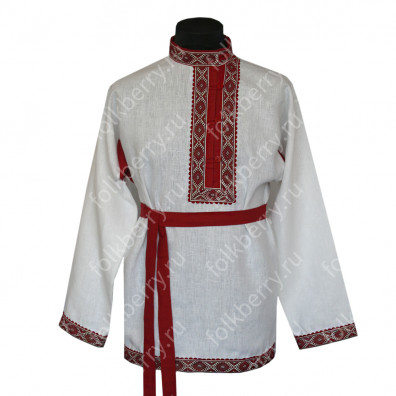 Косоворотка "Православная" выполнена из белого льна с соблюдением славянских традиций. Косоворотку украшает геометрический русский орнамент красно-белого цвета. Используется жаккардовая тесьма. Планка на груди, полики, пояс (кушак) выполнены в красном цвете. Косоворотка смотрится торжественно, из-за чего ее часто покупают для православных и праздничных мероприятий.
