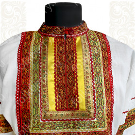 Ткань: хлопок или габардин ( полиэстер 100%, одежная ткань) на выбор покупателя  белого цвета. Цвет придает косоворотке торжественность. Ткань плотная, комфортная.