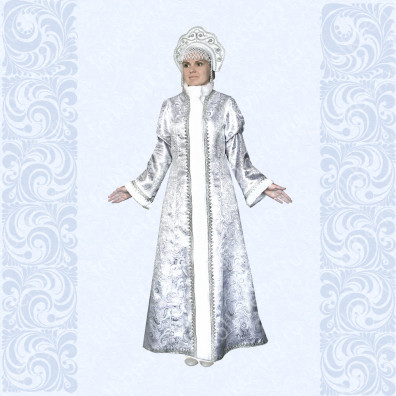 Костюм №8 выполнен из парчи бело-серебристого цвета. Костюм декорирован искусственным мехом белого цвета. Застежка - потайные кнопки. Силуэт - приталенный, сзади есть кулиска для регулировки талии. Красивый пышный рукав. Отделка - серебристая ажурная тесьма. Длина шубки по спинке 130 см (от седьмого шейного позвонка до низа изделия). Без подкладки.