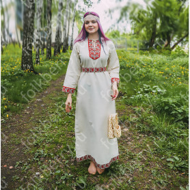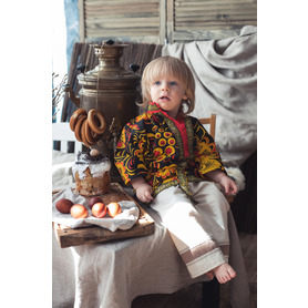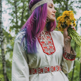 Выполнена из плотного льна, интересно украшена жаккардовым декором. Прямой свободный силуэт, воротник-стойка, втачной рукав, разрезы по боковым швам внизу, пояс в комплекте - делают рубаху удобной и комфортной. При заказе желательно указать обхват груди и рост, рубаху сошьем с учетом указанных Вами мерок.