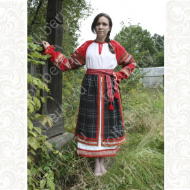 Декор платья - жаккардовая тесьма со славянскими символами. Талия немного завышена, пояс в комплекте.