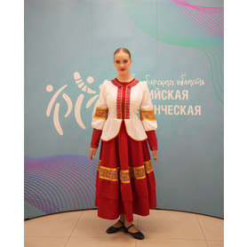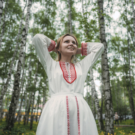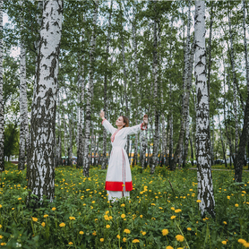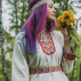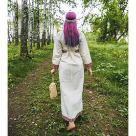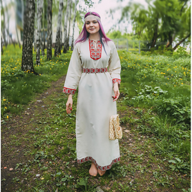 Платье  нежного красивого голубого цвета универсальное, т.к. хорошо садится по фигуре, благодаря регулируемой горловине, рукаву реглан, наличию длинного пояса.  Юбка (почти солнце) длиной немного ниже колена эффектно смотрится в танце. Талия слегка завышена. Декор платья - жаккардовая тесьма с обережными символами. Платье сшито из габардина, матовой, немнущейся ткани ярких цветов.