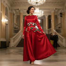 Платье сшито из яркого красного атласа и декорировано вставками с рисунком «хохлома». Юбка фасон полтора «солнца», подол и горловина украшены белым кружевом и тесьмой. Рукава «фонарики» сделаны из легкой, белой органзы.