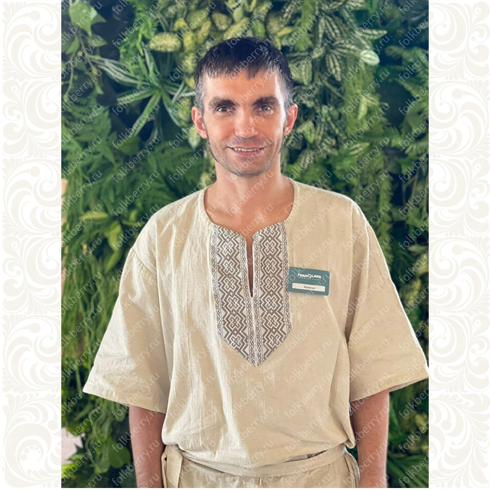 Рубаха мужская "Банька" предназначена для банщиков, массажистов и любителей бани и сауны. Сшита из мягкого комфортного льна светло-серого цвета,  ткань натуральная, не окрашенная красками, дышащая, не колючая.