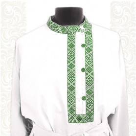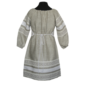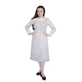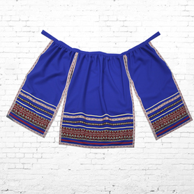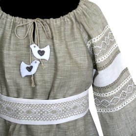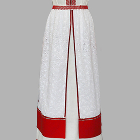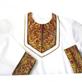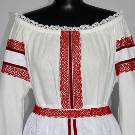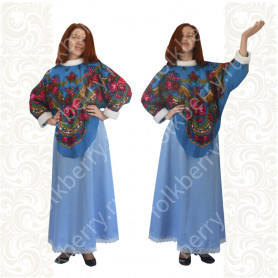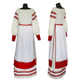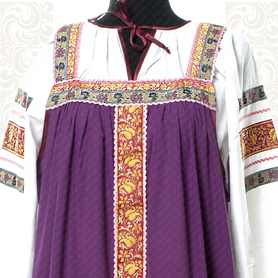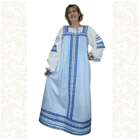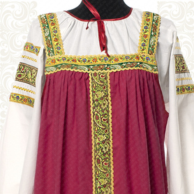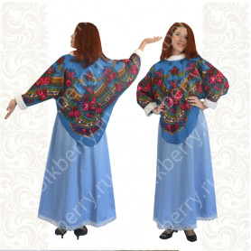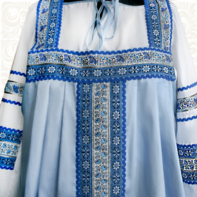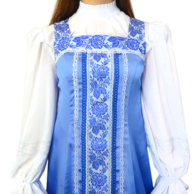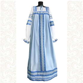 Длинный сарафан сшит из габардина , декорирован жаккардовой тесьмой и «вьюнком», создающей традиционный русский стиль. Белая блуза с пышными рукавами выполненная из хлопка и украшенная такой же тесьмой, что и сарафан смотрится очень эффектно.