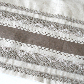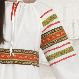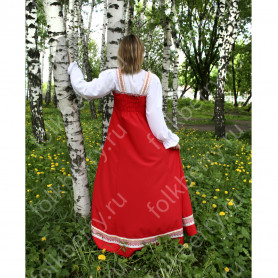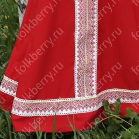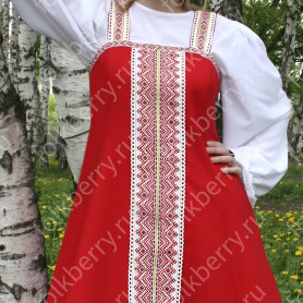 Благодаря ряду резинок на спинке, сарафан имеет хорошую посадку и выглядит очень женственно, расклешен к низу. Бретели регулируются по длине. Внизу юбки собран красивый декор из кружева, жаккардовой тесьмы разной ширины, красного и золотистого цвета, золотистого шнура, тесьмы «вьюнок».