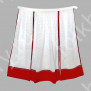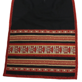 Юбка сшита из ажурного шитья, состоит из трех прямоугольных полотен, соединенных на поясе, украшена красным кружевом, бархоткой в тон, а также блестящей серебристой тесьмой.